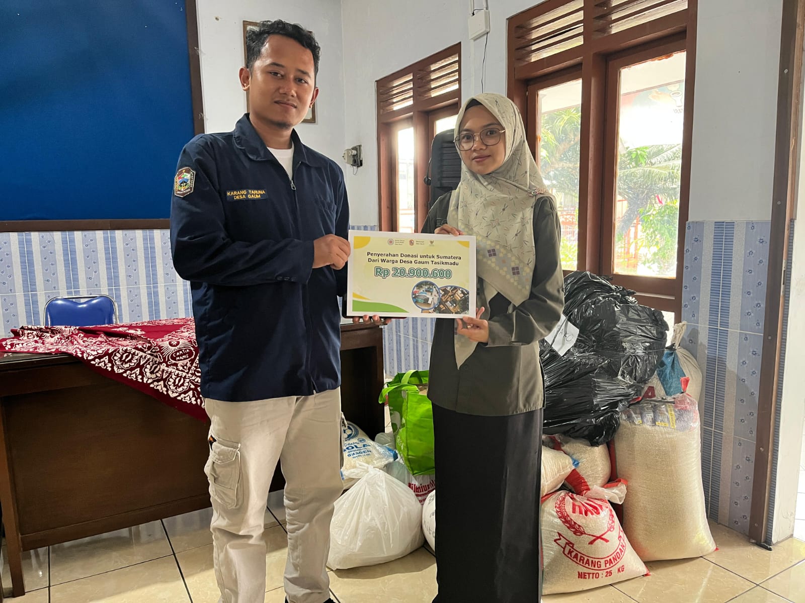 Penyerahan bantuan dilakukan secara simbolis oleh perwakilan Karang Taruna Desa Gaum di Kantor Desa Gaum, Tasikmadu. Bantuan yang terkumpul terdiri dari dana tunai sebesar Rp 20.900.600,- beras, dan bantuan berupa barang lainnya hasil penggalangan swadaya masyarakat yang dilakukan selama beberapa hari terakhir.